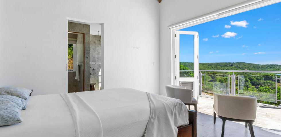 Upon entering through the main entrance, you are greeted by an open-concept kitchen, family, and dining area, highlighted by high ceilings and a gabled roof featuring an attractive post-and-beam design. To the left, a hallway leads to the master bedroom, which boasts the same captivating views of St. Thomas and includes doors that open to the outdoor space. The master bathroom and walk-in closet ensures privacy while maintaining the beautiful scenery that defines this remarkable home.